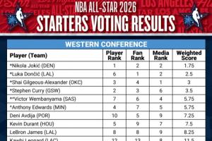 由表可以看出,约基奇是西部球员投票第一,东契奇是西部球迷投票的票王,而西部媒体投票第一是亚历山大。