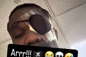 艾顿本场比赛第二节遭遇对手击打面部后左眼受伤退出比赛。艾顿晒出了自己左眼被包扎后戴上眼罩保护的自拍,并写道:“啊!!!🏴☠️😭💀😅”