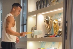 体育资讯1月25日讯 在本轮意甲联赛主场大胜比萨后,国际米兰迎来了短暂的休息时间,国米队长劳塔罗·马丁内斯在家中打扫了自己的奖杯。