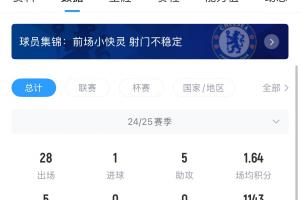 斯特林目前31岁,2019年德转身价一度高达1.6亿欧,目前仅500万欧。斯特林已经长达251天未出场,他上一次出场是2025年5月25日代表阿森纳出战伯恩茅斯。上赛季,斯特林各赛事出场28次,贡献1球5助。