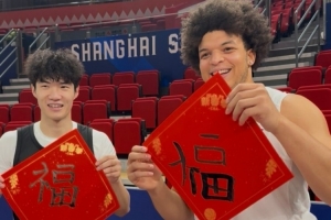 赛前,上海球员偰李永炜和外援洛夫顿用毛笔写福字。赛季至今,上海16胜4负位列联赛第三位。