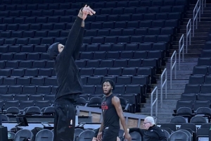斯科蒂·巴恩斯则是因为膝盖问题被列为出战成疑。他没有出现在投篮训练中,目前还没有新的伤情更新。