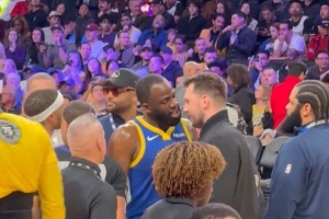 GIF-追梦场边狂喷东契奇 之后两人全笑了
