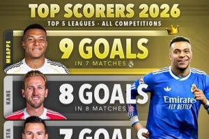 体育资讯2月10日讯 Score90统计了五大联赛球员2026年各赛事的进球数量,并列出2026年进球榜,姆巴佩7场9球居首。