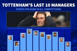 据德国转会市场统计,弗兰克执教热刺各赛事场均仅拿到1.32分,近10任热刺主帅场均积分最少。