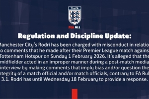 英足总官方写道:“监管与纪律更新:曼城的罗德里因在2026年2月1日周日对阵热刺的英超比赛后发表的言论,被指控行为不当。”