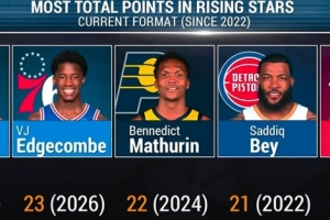 埃奇库姆合计得到23分,自全明星新秀赛新模式以来(2022年)第二高,仅次于2023年的格莱姆斯。