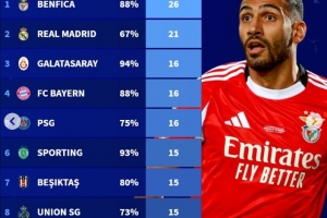 1.本菲卡 26个点球 命中率88%