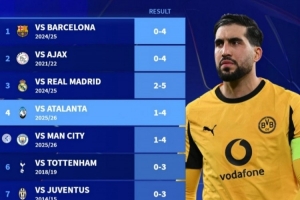 体育资讯2月27日讯 在欧冠淘汰赛附加赛次回合,多特1-4不敌亚特兰大,总比分3-4被淘汰。德转也盘点了多特在欧冠最大比分失利榜单,具体如下: